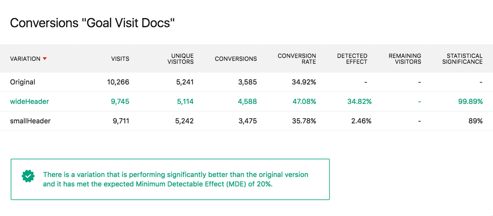 Get a detailed breakdown of your test's variations with all the metrics that matter. If one reaches statistical significance within the desirable detectable effect, you'll be informed right away so you can roll out the changes confidently.
