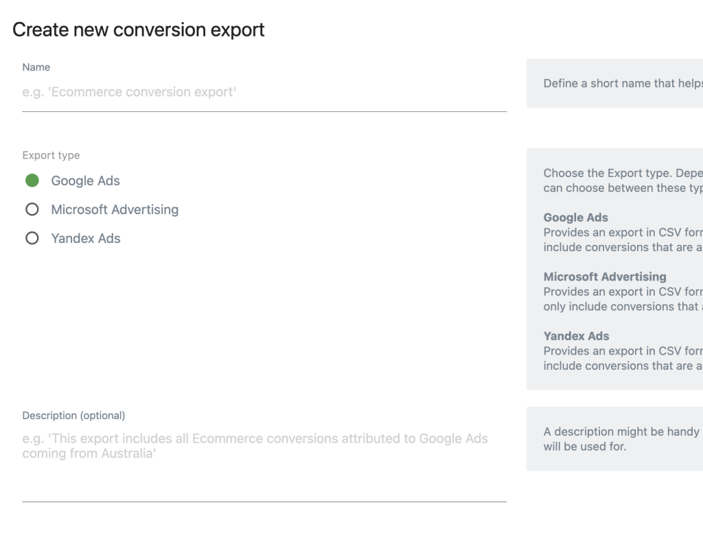 Setting up the Advertising Conversion Export plugin is like a walk in the park. Start by naming your export and choosing the ad network. Then, select the desired number of days of conversion data and define your goals, including your objective and revenue value.