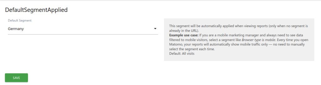 When configured, the selected segment is automatically applied to all report pages, saving users from having to manually select their preferred segment each time they access Matomo. The segment is applied transparently via the URL and respects manually selected segments — it only activates when no segment is already present in the URL.