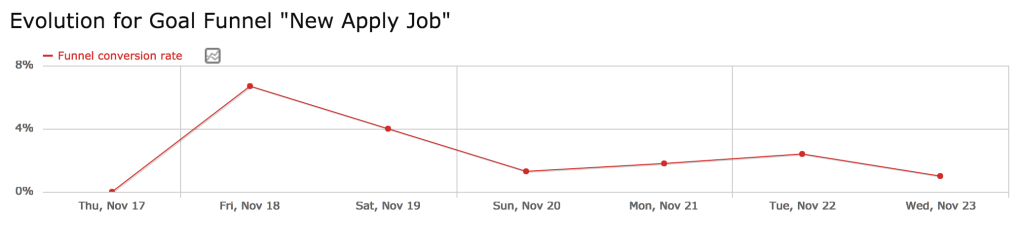 See how your funnels perform over time with trend analysis. Keep yourself informed on key funnel metrics like the “Funnel conversion rate”, “Number of funnel conversions”, and “Number of funnel entries.”