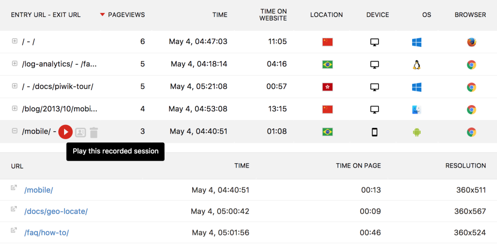 - Visitor summary shows used browser, operating system, location, viewport resolution, spent time on the page, and more.