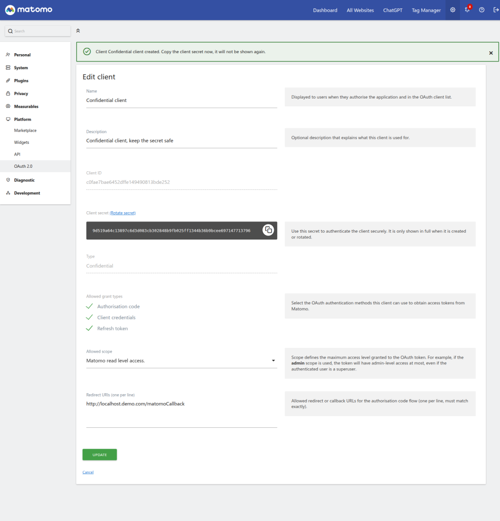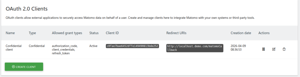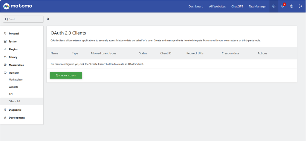 • Manage OAuth clients via Administration → Platform → OAuth 2.0 (For Matomo Cloud it will be Administration → Export → OAuth 2.0)