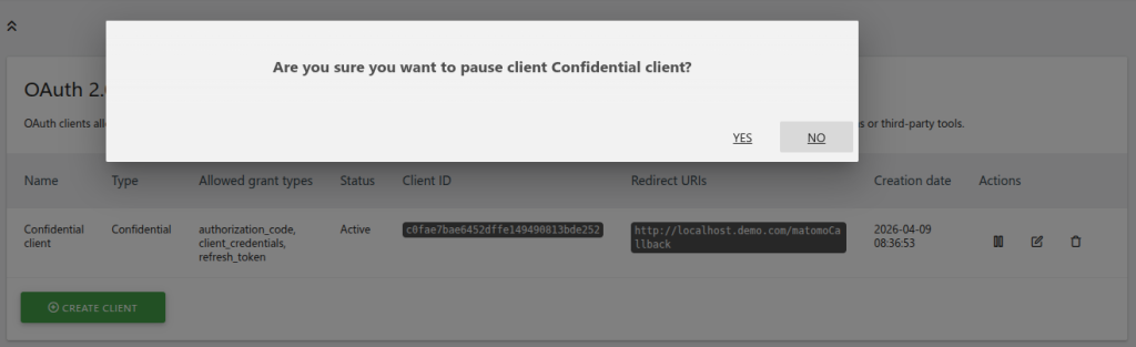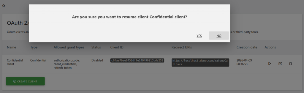 • Client management UI with create, edit, pause/resume, delete, and secret rotation for confidential clients