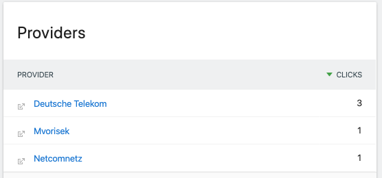 This plugin adds a new report to your Matomo showing which Internet Service Providers your visitors used to access your website. You can click on a provider name for more details. If Matomo can't determine a visitor's provider, it is listed as IP.