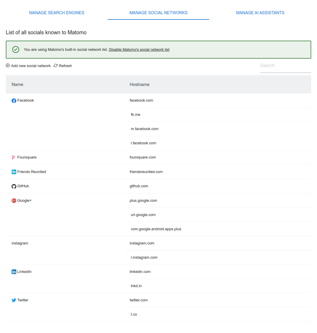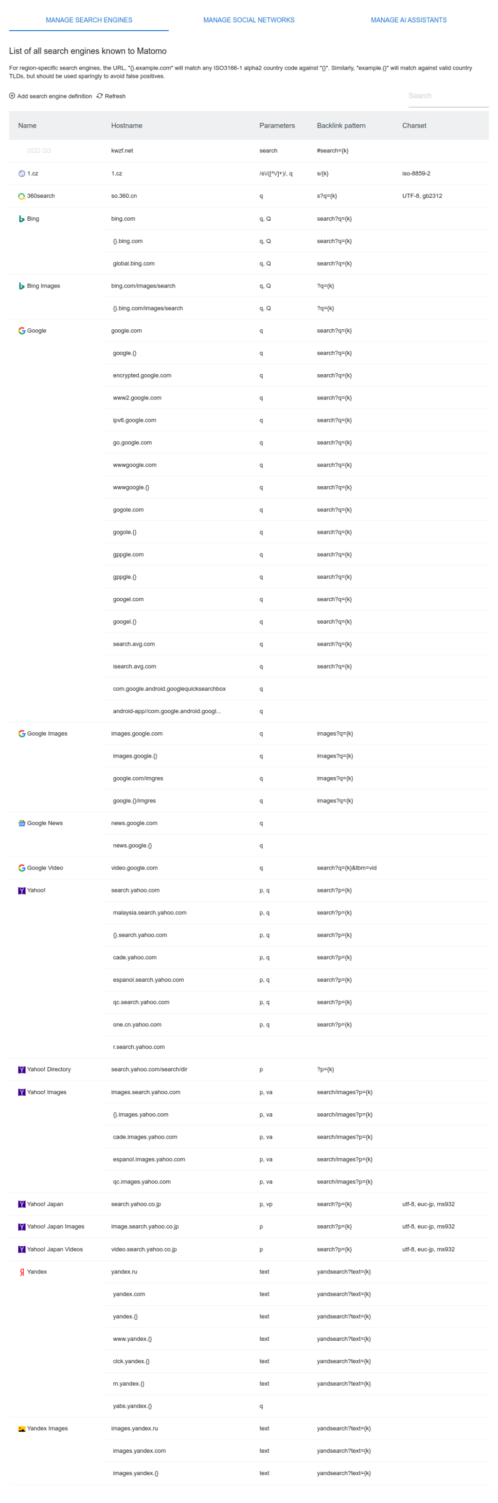 Allows to view and manage the search engines, social networks, and AI assistants that Matomo is able to detect.