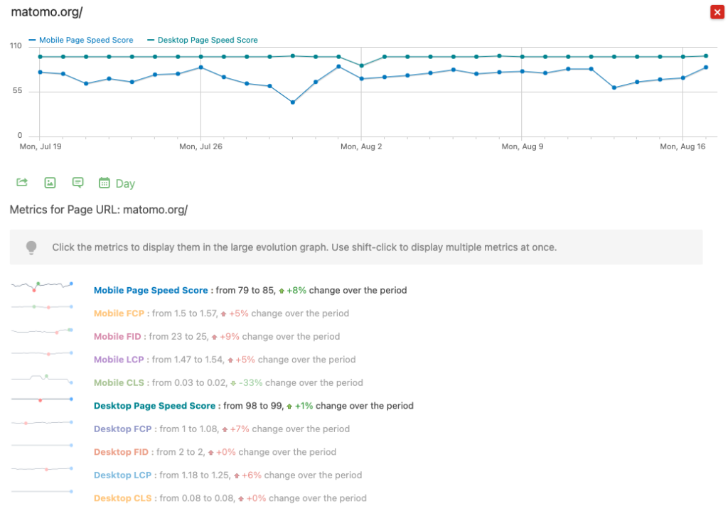 Get a detailed perspective on your pages' speed performance by tracking their Page Speed Score through time. Dig deeper into any Core Web Vitals metrics on desktop and mobile devices and gain a better understanding of their changes.