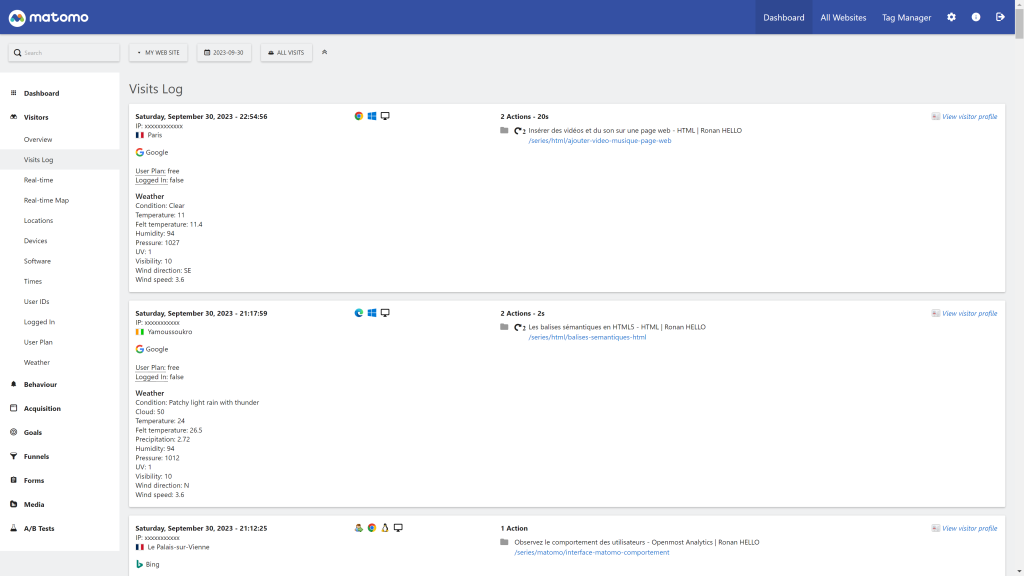Now that the plugin is correctly configured, you will find the different reports in the "Weather" section of the Matomo "Visitors" menu.