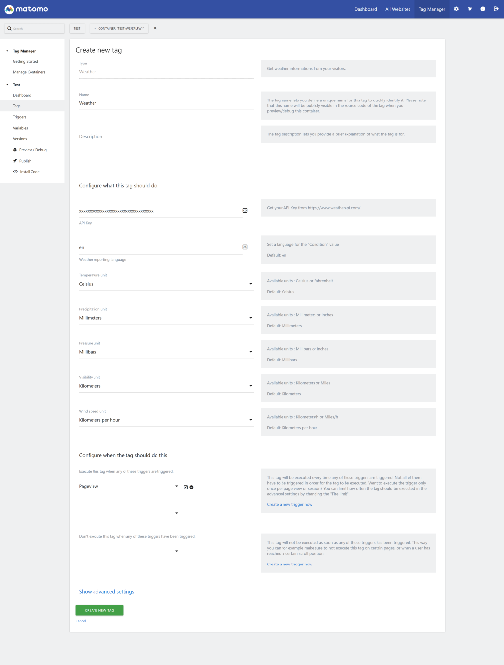 Use the Weather custom Tag in Matomo Tag Manager (in the Openmost section)